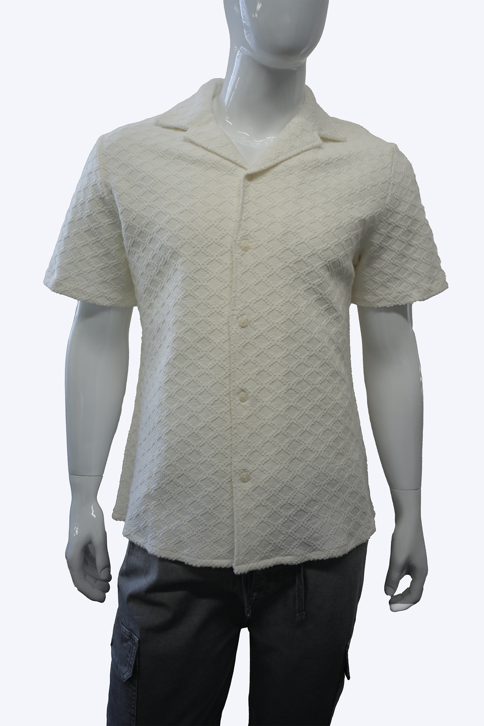 The Aventura Shirt is cut from plush 100% cotton fabric with a diamond textured weave. It features a relaxed, boxy fit, button up front placket, camp collar and short sleeves.
