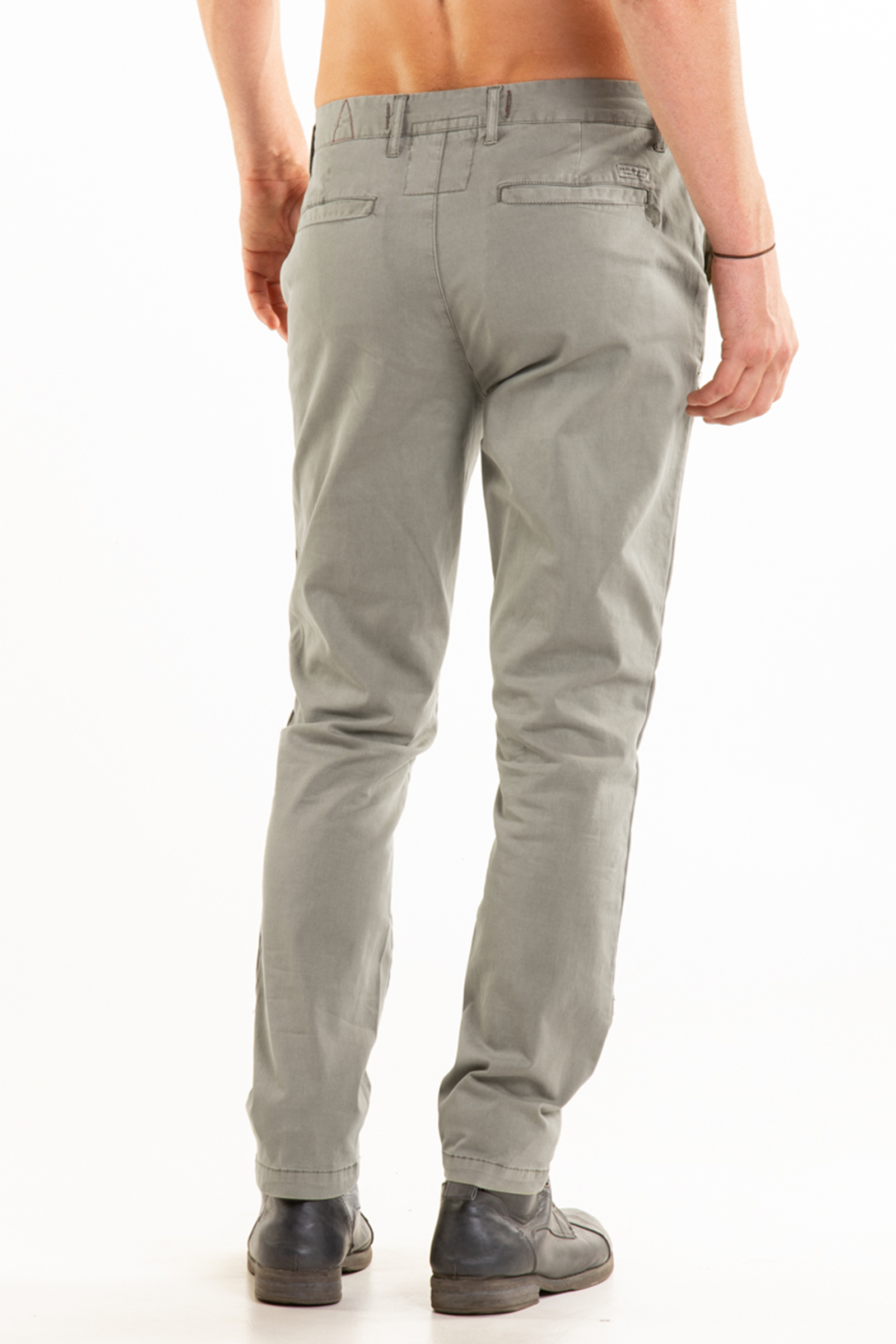 This Distrssed Chino Pant is cut from lightweight 100% Cotton Twill fabric and features a tapered fit. This pant has grinding on the pocket opening and bottom hem, and is garment dyed so that there are highs and lows of color.
