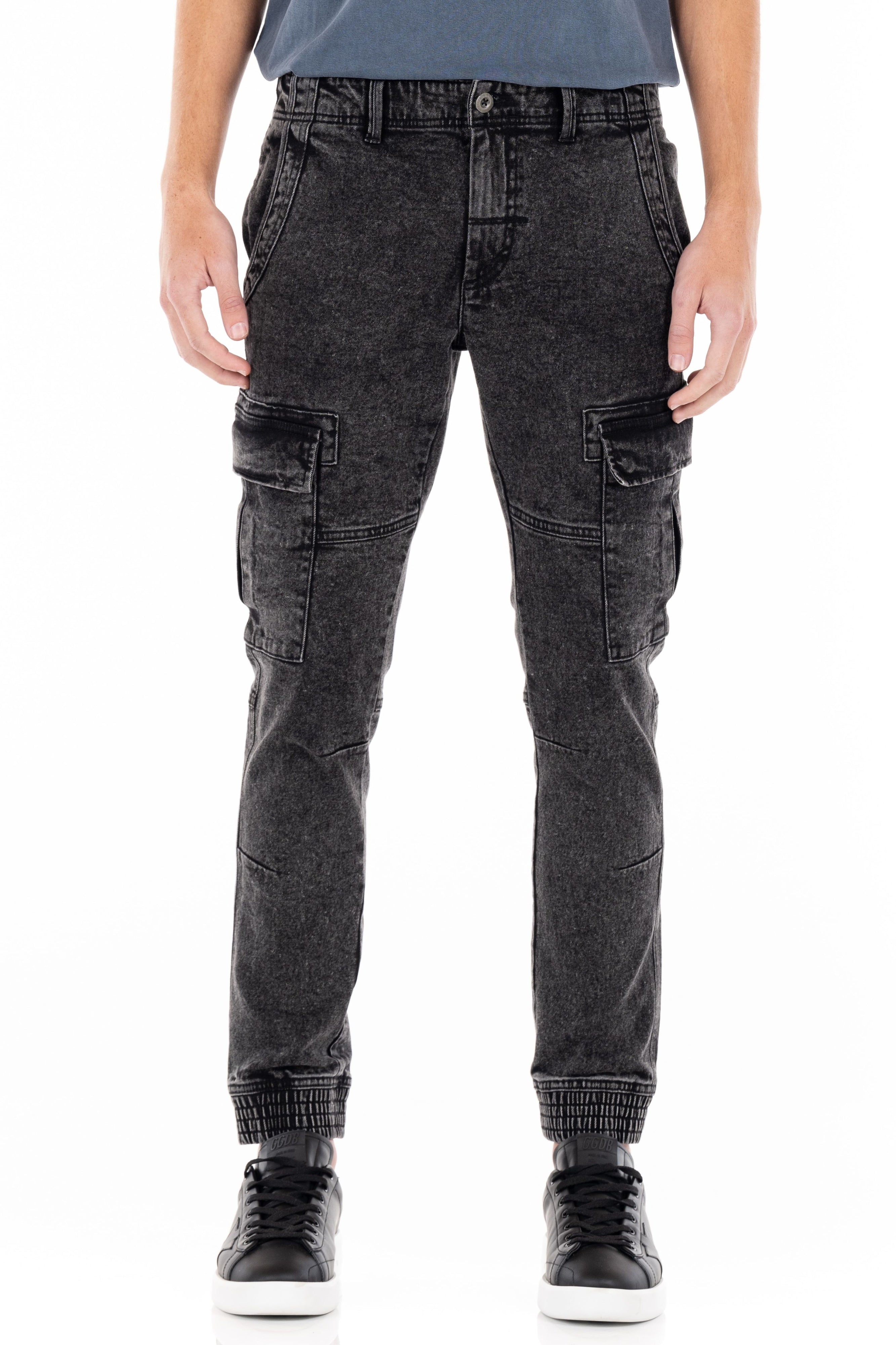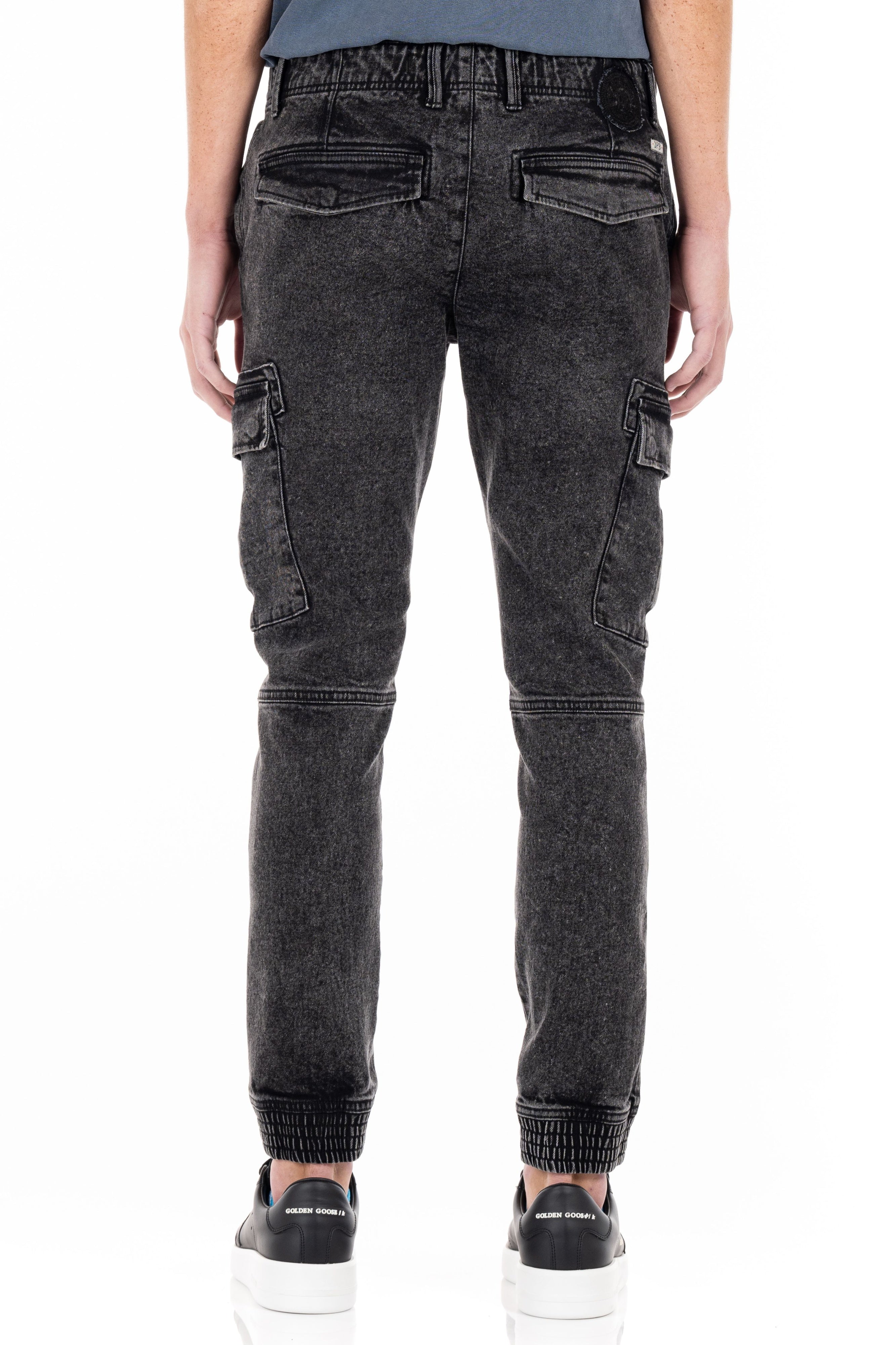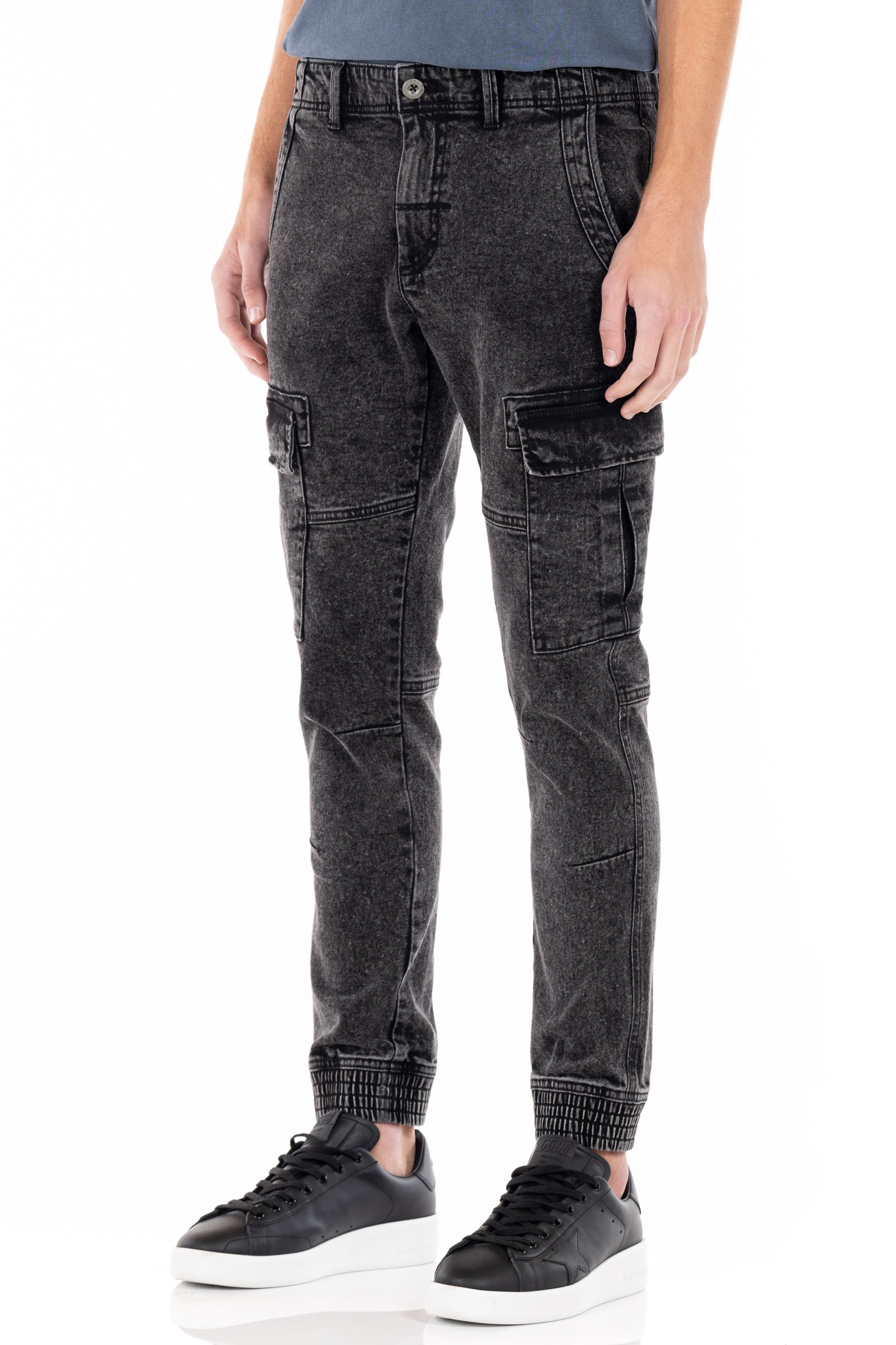 The Trenton Stretch Jogger is cut from stretch denim fabric and features a tapered leg fit. This jogger has a two slanted chino pockets, two back pockets, and two side cargo pockets. It features an elastic leg opening and a mineral wash effect for a vintage look.