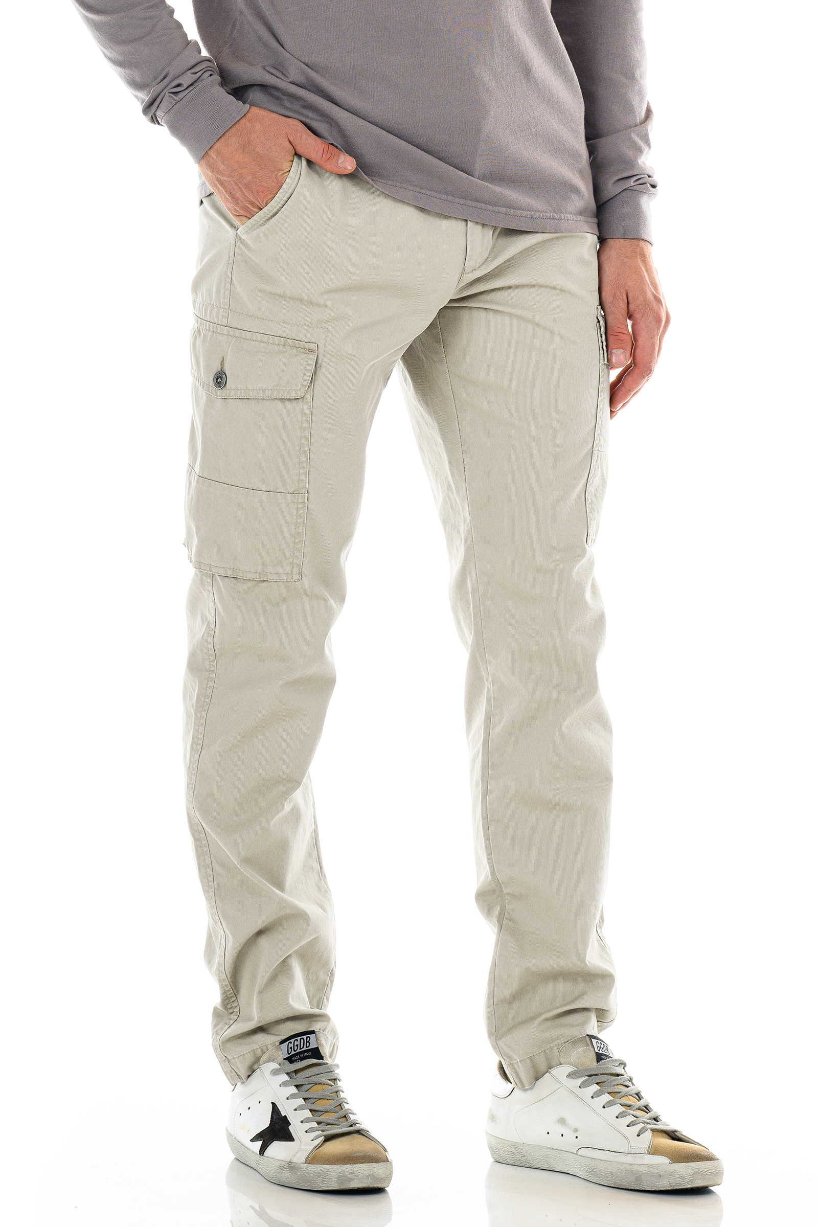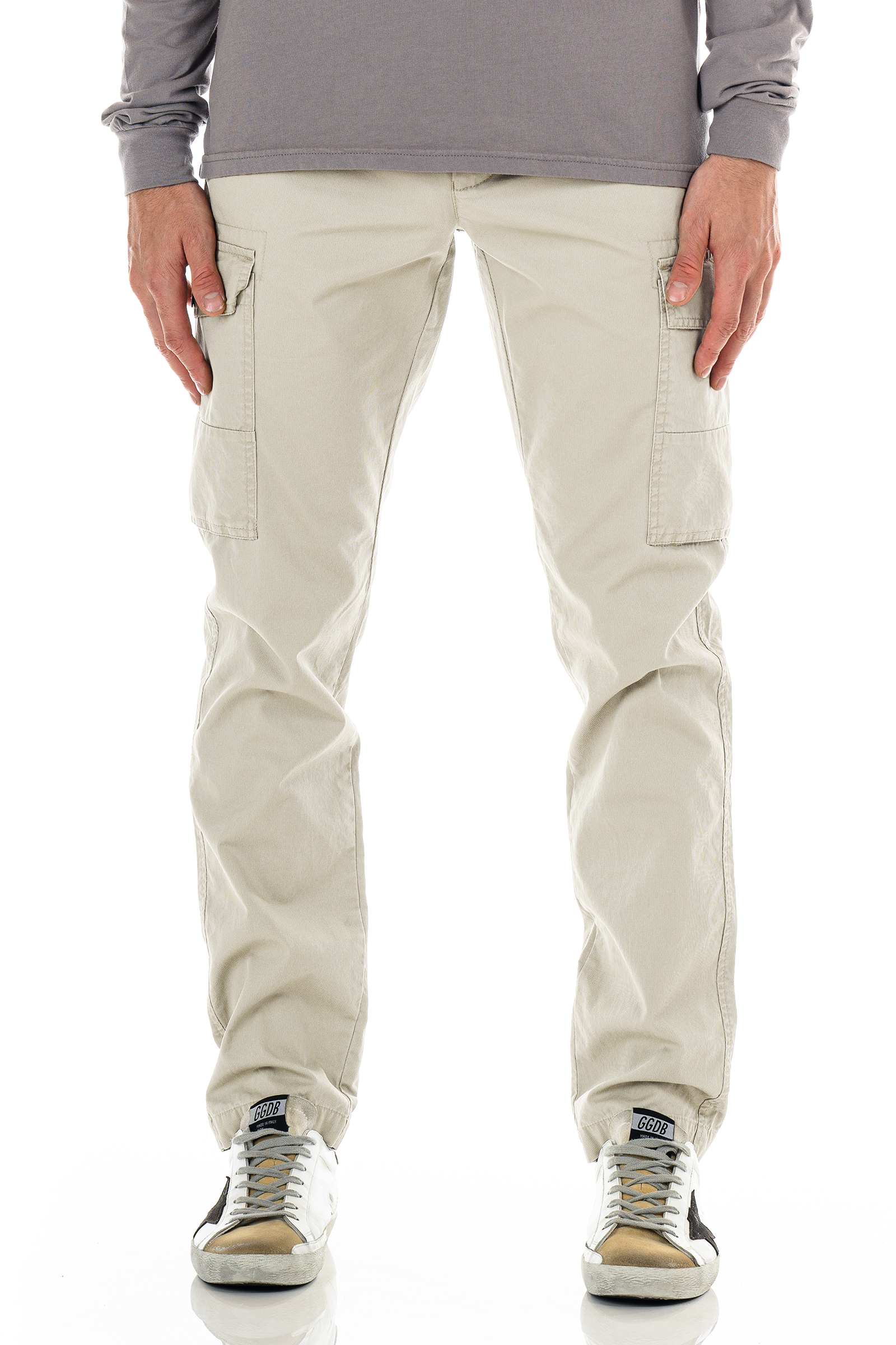- Slanted front pockets, back welt pockets, side cargo pockets, and front coin pockets