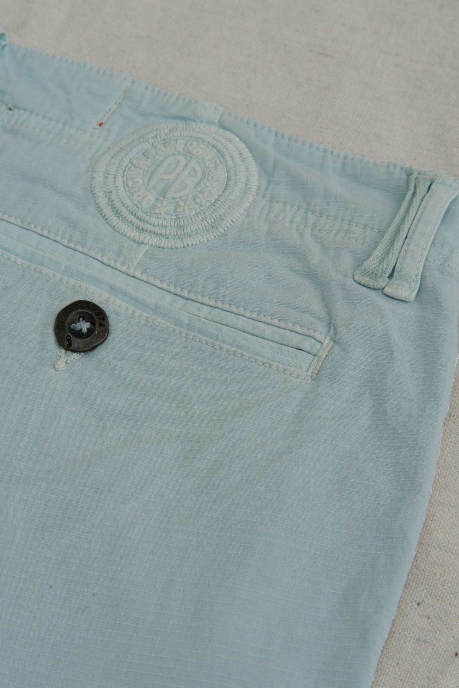 Detail: Structured waistband with belt loops. Front button closure and zipper fly. Side slash pockets. Front coin pocket at wearer's right. Two back open welt pockets. 3/4" clean bottom hem. 5" inseam.